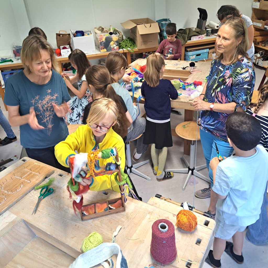 In der Schule wurde der zweite Teil des Projekts durchgeführt. HERTHA GLÜCK brachte ein Auto voll mit alten Holzgegenständen in die Schule. Dann ging es los. Die Wollkünstlerinnen Saskia Valazza und Sabine Henning fertigten mit den Schüler:innen kreative Kunstwerke aus Wolle und Holz. Dabei entstanden verschiedene farbenfrohe, fröhliche Objekte, welche die große Fantasie der Kinder zeigen und damit die Erwachsenen überraschen.